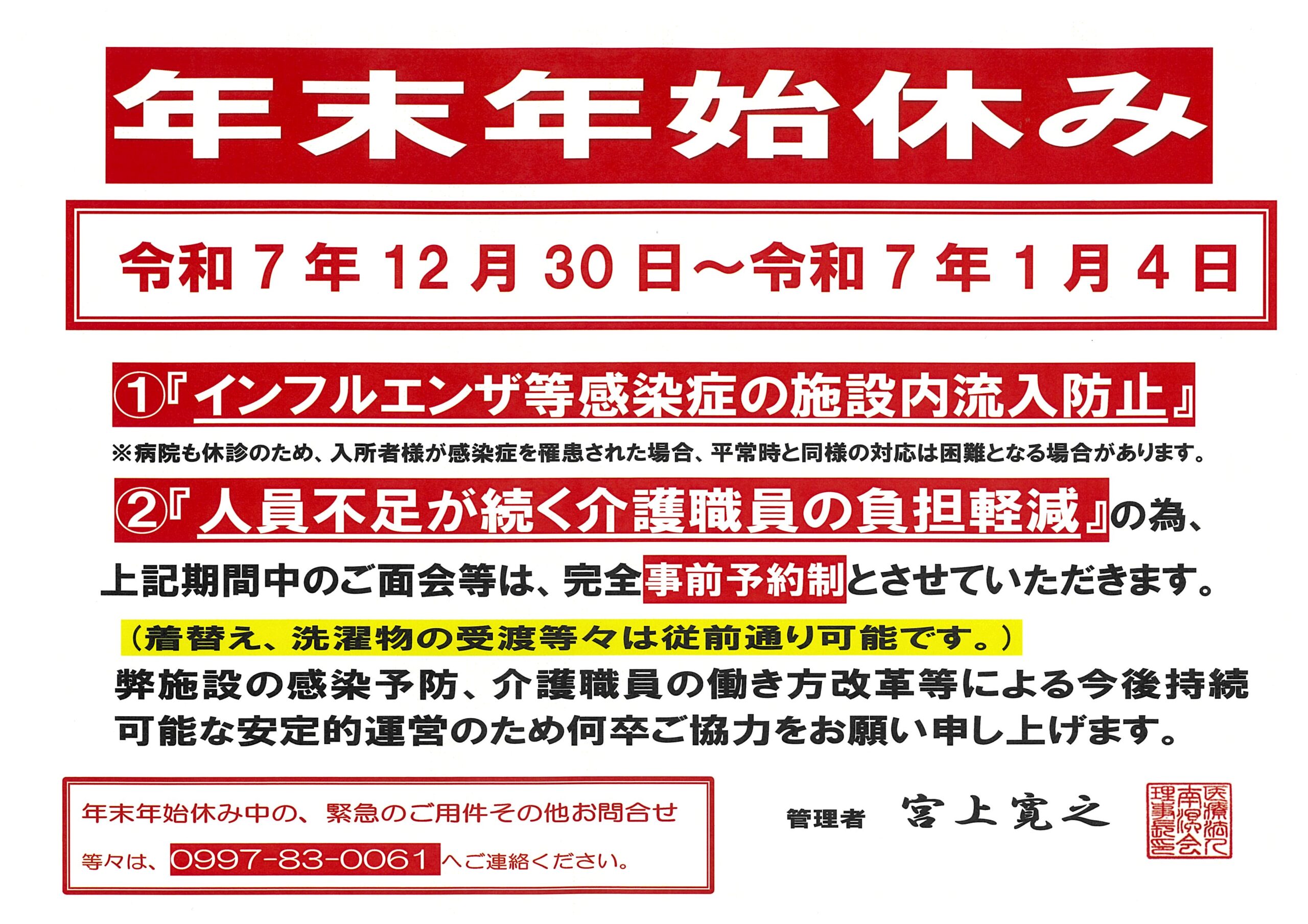 令和7年12月30日~令和8年1月4日まで年末年始休みとさせていただきます。その間のお問合せ等は、お手数ではございますが0997-83-0061までお願い申し上げます。
